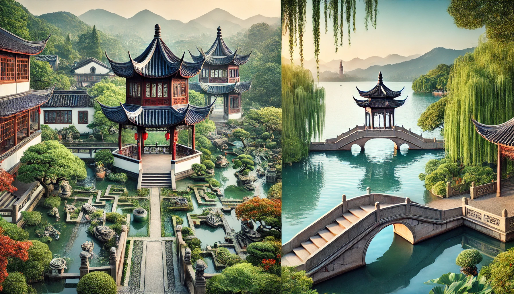 | 주요 명소 | 졸정원, 유원, 쑤저우 운하 | 서호, 영은사, 용정차 마을 |